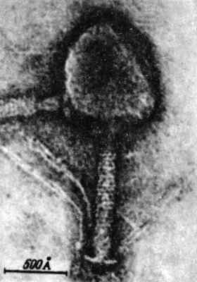 Самые сложные вирусы – бактериофаги, или просто фаги – паразиты бактерий. Примером могут служить так называемые Т‑четные фаги бактерии кишечной палочки. Фаг Т4 напоминает по форме ручную гранату. Головка фаговой частицы – вытянутый двадцатигранник, сложенный из молекул белка, в ней содержится в компактно уложенном состоянии длинная молекула ДНК. Фаг Т4 – имеет сложный механизм для вспрыскивания своего генотипа внутрь бактериальной клетки – хвостовую часть. Хвостовая часть состоит (от головки к концу) из воротничка, собственно хвоста, одетого сократимым, как мускульное волокно, чехлом, и базальной пластинки, от которой отходят шесть нитей. Нитями и зубцами базальной пластинки фаг прикрепляется к клеточной оболочке бактерии. Молекула специфического белка лизоцима на базальной пластинке разъедает оболочку бактерии, хвостовой чехол сокращается, и нить ДНК с огромной скоростью выталкивается, буквально выстреливается в цитоплазму бактерии.