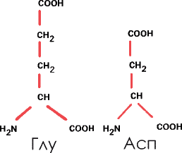 В эту группу входит единственная аминокислота, не содержащая асимметричного атома углерода (глицин). В прочих атомы углерода содержат разные радикалы, асимметричны, и потому эти аминокислоты могут быть представлены в правых и левых формах (а в белках – только в левых). 2. Кислые аминокислоты. Этот термин, напоминающий «масло масляное», означает, что они содержат еще один радикал –COOH, кроме того, который образует пептидную связь. Они и в белке сохраняют кислотные свойства. Это уже упоминавшаяся глутаминовая кислота (Глу) и аспарагиновая (Асп):