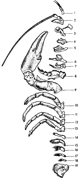 Рис. 24. На предыдущих рисунках вы видели примеры избыточности информации а строении тела членистых животных – кольчатых червей, трилобитов, многоножек. У высших членистых монотонность сменяется разнообразием, новая информация возникает за счет избыточной. У речного рака практически каждую конечность надо описывать отдельно, ибо они выполняют разные функции и имеют разную форму: первая и вторая пара – органы чувств, с третьей по пятую – челюсти, с шестой по восьмую – ногочелюсти (передают пищу челюстям), с девятой по тринадцатую – ходильные, с четырнадцатой по восемнадцатую – брюшные. Последняя пара образует «хвостовой» веер: хлопая им, рак плывет задом наперед (ползает он, как и все прочие животные, головой вперед, а не пятится).