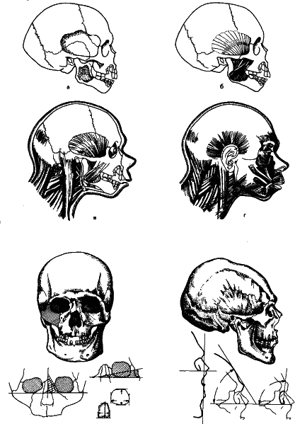 Рис. 28. В организме одна структура может с большей или меньшей жесткостью определять детали строения другой. Именно это позволило нашему замечательному анатому, антропологу, археологу и скульптору М. М. Герасаимову разработать метод восстановления лица по черепу. Здесь приведены две схемы: реконструкция лица неандертальского мальчика из грота Тешик‑Таш и головы скифского воина из богатого погребения. Любопытно, что, когда был изготовлен его скульптурный портрет, историки опознали его по барельефам и монетам. Это оказался скифский царь Скилур.