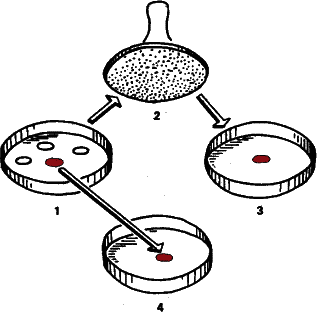 Рис. 36. Супруги Ледерберги выращивали в чашках Петри на поверхности агара тысячи колоний бактерий, а затем стерильным бархатным штампом переносили их с сохранением прежнего положения в другие чашки, где среда содержала смертельную дозу антибиотика. Если число пересеваемых колоний было достаточно велико, всегда находилась хотя бы одна, устойчивая к антибиотику. При этом нетрудно было убедиться, что материнская колония также состоит из устойчивых бактерий, хотя с антибиотиками они и не встречались.