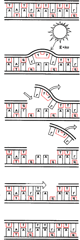 Рис 35. Организм активно защищает свои генетические программы от внешних воздействий. Допустим, на участке ДНК (1) возникло повреждение. Квант ультрафиолета, проникнув в ядро, вызвал сшивку двух соседних пиримидиновых оснований, возник димер тимина (2). ДНК с таким дефектом не может работать, синтезировать себя или РНК. Молекулы ферментов ДНК– и РНК‑полимераз, дойдя до сшивки, застрянут на ней, как застревает замок застежки‑«молнии», если в нее попала нитка. Но не все потеряно, на помощь приходят ферменты‑репаразы. Эндонуклеаза «отстригает» поврежденный участок (3–4), а брешь в двойной спирали достраивается другим ферментом, ДНК‑полимеразой, по оставшейся комплементарной нити‑матрице. Достроенный отрезок пришивается к старой последовательности ферментом лигазой. Этот процесс также активируется светом, но более длинноволновым (300–600 нанометров). Так что, если хотите сохранить свои генетические программы в целости, не загорайте на пляже, а грейтесь у камина. Репаразы «ремонтируют» участки ДНК, к которым присоединились молекулы мутагенов, разрывы нитей и ошибки спаривания. В норме остаются лишь доли процента возникающих мутаций, но и этого достаточно, чтобы обеспечить материалом эволюцию.