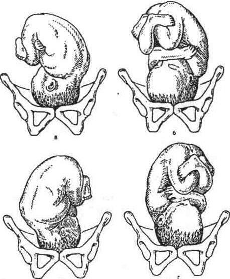 У першому, другому, на початку третього триместрів вагітності, коли розміри плоду порівняно невеликі, навколоп-лодових вод відносно багато, його розміщення в порожнині матки досить варіабельне. В останні 2-3 місяці вагітності положення плоду стає більш стійким і зберігається до його народження. Для характеристики розміщення плода у матці користуються спеціальними термінами. Членорозміщення (habitus) - це співвідношення окремих частин плоду (голови, кінцівок, тулуба), фізіологічним вважається згинальне членорозміщення плоду (habitus flexus), коли тулуб зігнутий, голівка нахилена до грудної клітки, верхні кінцівки схрещені на грудях, ніжки зігнуті в колінних і кульшових суглобах і притиснуті до живота. Положення плоду (situs) - це відношення осі плоду до вертикальної осі матки. Вісь плоду - це лінія, що проходить по його спинці від потилиці до куприка. Розрізняють поздовжнє, косе і поперечне положення. Поздовжнє положення (situs longitudinalis) - вісь плоду співпадає з вертикальною віссю матки. Поперечне положення (situs transversus) - вісь плоду і вісь матки перетинаються під прямим кутом. Косе положення (situs obliqus) - вісь плоду і вісь матки перетинаються під гострим кутом. Позиція плоду (positio) - розташування спинки плоду щодо правого або лівого боків матки. Розрізняють першу та другу позиції. Перша позиція - спинка плоду обернена до лівого боку матки. Друга позиція - спинка плоду обернена до правого боку матки. При поперечних і косих положеннях плоду позицію визначають за голівкою. Вид позиції - відношення спинки плоду до передньої чи задньої стінки матки. Розрізняють передній та задній вид. При передньому виді спинка плоду обернена до передньої стінки матки, при задньому - до задньої. Передлежання плоду (praesentatio) - розташування крупної частини плоду (голівки чи тазу) щодо площини входу в таз. Відповідно розрізняють головне і тазове передлежання. Передлегла частина - це та частина плоду, яка знаходиться ближче до входу в малий таз і першою проходить через родові шляхи. Якщо при головному передлежанні найнижче розміщується потилиця, то таке передлежання називається потиличним. Вставлення голівки - розміщення сагітального шва відносно симфізу і крижового мису (промонторію). Розрізняють осьове, або синклітичне, і позаосьове, або асинклітичне вставлення голівки. При вузькому тазі може виникнути передній або задній асинклітизм. Передній асинклітизм - у вхід до порожнини малого тазу вставляється передня тім'яна кістка, сагітальний шов розміщений ближче до мису. Задній асинклітизм - у вхід до порожнини малого тазу вставляється задня тім'яна кістка, сагітальний шов розміщений ближче до симфізу.