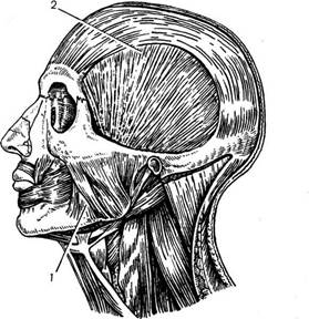 1.Жевательные мышцы (по В. П. Воробьеву и Р. Д. Синельникову). 1 — жевательная мышца; 2 — височная мышца.