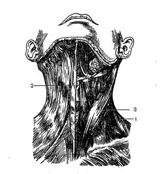3.Поверхностные мышцы шеи (по В. П. Воробьеву и Р. Д. Синельникову). 1 — трапециевидная мышца; 2 — подкожная мышца шеи; 3 — грудиноключично-сосцевидная мышца.