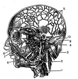 5. Вены головы (по Р. Д. Синельникову). 1 — внутренняя яремная вена; 2 — лицевая вена; 3 — нижнечелюстная вена; 4 — поверхностная височная вена; 5 — подкожная венозная сеть; 6 — лицевая вена; 7 — угловая вена; 8 — крыловидное сплетение; 9 — задняя ушная вена; 10 — затылочная вена.