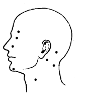 височные, скуловые, щечные, краевая ветвь нижней челюсти и шеи. Они иннервируют все мимические мышцы лица, кожу головы, затылочное брюшко затылочно-лобной мышцы, мышцы ушной раковины, частично мышцы дна полости рта и подкожную мышцу шеи. Тройничный нерв иннервирует кожу головы (кроме затылочной области), лица. Он образует 3 ветви: п е р в а я — глазной нерв — иннервирует кожу лба, верхнего века, слезные железы, слизистую оболочку полости носа; в т о р а я — верхне-челюстной нерв — иннервирует кожу нижнего века, боковой поверхности носа и верхней губы, передней части височной области и слизистую оболочку щеки, верхней губы, верхние зубы, десну; т р е т ь я — нижнечелюстной_нерв (смешанный) — иннервирует кожу лица ниже угла рта, нижнюю губу, слизистую оболочку щеки, дна, полости рта, языка нижние зубы и десну, слюнные железы, жевательные мышцы. Иннервация шеи осуществляется ветвями шейного сплетения и задними ветвями шейных нервов, которые иннервируют кожу и глубокие мышцы задней области шеи. Передние ветви шейных нервов, соединяясь, образуют Шейное сплетение. Ветви, отходящие от сплетения, подразделяются на кожные, мышечные и смешанные. Они иннервируют кожу затылочной области, ушной раковины, шеи. Мышечные ветви иннервируют трапециевидную и грудиноключичн0-сосцевидную мышцы. В области головы и лица имеются болевые точки (рис. 7). Интенсивные движения при массаже в области этих точек дают неприятные ощущения. АНАТОМИЯ И ФИЗИОЛОГИЯ КОЖИ
