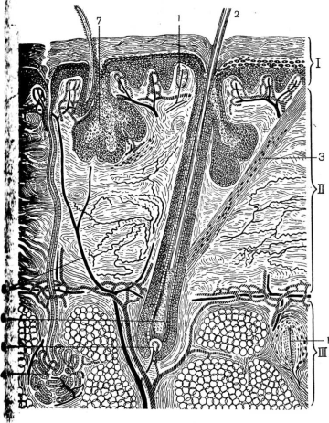 8. Строение кожи (схема). I- эпидермис, II — собственно кожа, III — подкожная жировая клетчатка; 1- нервные рецепторы, 2 — волос, 3 — мышца, поднимающая волос 4 — жировая железа, 5 — волосяной сосочек, 6 — волосяная луковица, 7 — сальная железа, 8 — кровеносные сосуды.