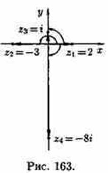 Если точка z лежит на действительной или мнимой оси, то argz можно найти непосредственно (см. рис. 163). Например, argz1=0 для z1=2; argz2=π для z2=-3; arg z3=p/2 для z3=i и arg z4=-p/2 для z4=-8i. Используя формулу Эйлера еiφ=cosφ+isinφ, комплексное число z=r(cosφ+isiπφ) можно записать в так называемой показательной (или экспоненциальной) форме z=rеiφ, где r=|z| — модуль комплексного числа, а угол φ=Argz=argz+2kp (k=0,-1,1,-2,2...). В силу формулы Эйлера, функция еiφ периодическая с основным периодом 2p. Для записи комплексного числа z в показательной форме, достаточно найти главное значение аргумента комплексного числа, т. е. считать φ=argz.