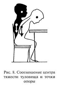 Правильной считается такая осанка, которая наиболее благоприятна для функционирования как двигательного аппарата, так и всего организма. У детей дошкольного возраста правильную осанку характеризуют следующие признаки: голова немного наклонена вперед, плечевой пояс незначительно смещен кпереди, не выступая за уровень грудной клетки (в профиль); линия грудной клетки плавно переходит в линию живота, который выступает на 1 —2 см, угол наклона таза невелик. При правильной осанке глубина шейного и поясничного изгибов позвоночника близки по значению и колеблются у детей дошкольного возраста в пределах 3—4 см. Для выработки правильной, непринужденной, прямой посадки с легким наклоном головы важно каждому ребенку подобрать подходящую мебель и научить пользоваться ею. Сидя за столом, ребенок должен держать тело в определенном положении, при этом напрягаются мышцы шеи и спины. Напряжение мышц особенно велико в тех случаях, когда ребенок сидит не прямо, а с наклоном вперед (рис. 8). Чтобы уменьшить напряжение шейных и спинных мышц, возникающее при наклонном положении туловища, ребенок должен стремиться опереться грудью о край стола, за которым сидит. Такая посадка быстро утомляет, так как грудная клетка сдавливается, глубина дыхания, следовательно, и поступление кислорода в ткани и органы уменьшается. Привычка сидеть с опорой на грудную клетку может привести к деформации грудины, появлению сутулости и близорукости.