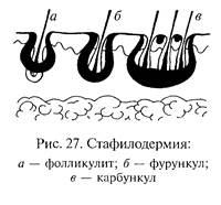 Кожа детей легко загрязняется, во время игры или работы на участке, в саду, огороде. Пыль, грязь и содержащиеся в них микроорганизмы — стафилококки и стрептококки — внедряются в кожные бороздки, углубления и неровности. Грязь раздражает кожу, вызывает зуд и расчесы, через которые, так же как через царапины, ссадины и раны, гноеродные микроорганизмы проникают в глубь кожи, нередко вызывая гнойничковые заболевания Они чаще всего протекают в виде стрептодермии и стафилодермии. Стрептодермии — это гнойничковые поражения кожи, вызванные стрептококками; характеризуются поверхностным поражением гладкой кожи и ее складок (импетиго, заеда, паронихия). Импетиго (от лат. impetus — внезапный) отличается высокой контагиозностью и характеризуется высыпанием пузырьков на покрасневшем фоне. На месте проникновения гноеродного микроорганизма, чаще на открытых частях тела; углы рта (заеда), за ушами, валик ногтя (паронихия) — образуется сначала красное пятно или припухание, а затем пузырек размером от булавочной головки до десяти копеечной монеты. Вскоре пузырек превращается в гнойничок, который при подсыхании докрывается тонкой желто-оранжевой корочкой («медовая корка»). Рядом образуются новые пузырьки и корки. Заболевание легко переходит не только с одного места кожи на другое, но и от одного ребенка к другому, поэтому больного надо отделить от других детей. Стафилодермии — гнойничковые заболевания, вызываемые стафилококками; характеризуются поражением придатков кожи (фолликулы волос, потовые и сальные железы). Фолликулит — воспалительное поражение волосяного мешочка. Заболевание характеризуется появлением небольших, величиной 1 —2 мм гнойничков, пронизанных в центре волосом и окруженных узкой розовой каймой. При благоприятном течении через 3—4 дня содержимое гнойничков подсыхает, образуются желтоватые корочки, после отпадения которых на коже не остается следов (рис. 27, а). Фурункул (чирей) — острое воспаление волосяного фолликула, сальной железы и подкожной жировой клетчатки. За 3—5 дней фурункул увеличивается, достигая размеров лесного ореха и больше. Кожа в области фурункула краснеет, истончается. После вскрытия в центре видны омертвевшая ткань и язва, после заживления которой остается рубец. Если в ранних стадиях развития фурункула принять необходимые меры (наложение чистой ихтиоловой повязки, физиотерапевтическое лечение и др.), он может рассосаться, и тогда рубец не образуется (рис. 27, б).