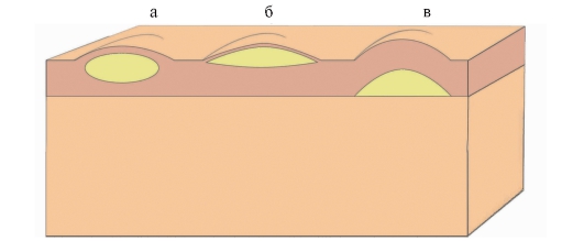 Рис. 1-13. Пузырь: а - внутриэпидермальный, б - субкорнеальный, в - субэпидермальный появляется на фоне отечного эритематозного пятна, но может возникать и на визуально неизмененной коже (вульгарная пузырчатка). Date: 2015-07-02; view: 839; Нарушение авторских прав |