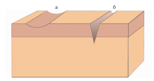 Рис. 1-17. Вторичные морфологические элементы: а - ссадина; б - глубокая трещина (лучезапястного сустава, локтевого сгиба, например, при атопическом дерматите, хронической экземе). Особенность формирования трещин заключается в образовании кожного линейного дефекта, расположенного перпендикулярно вектору растяжения кожи. • Поверхностные трещины (fissura) располагаются только в эпидермисе и поэтому не оставляют рубцов или атрофии. • Глубокие трещины (rhagas) кровоточат и заживают с образованием рубцов. Например, при врожденном сифилисе возможно образование глубоких радиальных трещин вокруг рта с последующим формированием рубцов Робинсона-Фурнье. Эрозия Эрозия (erosio) (рис. 1-18, а) - поверхностный дефект эпидермиса, который образуется после вскрытия экссудативных первичных элементов (пузырька, пузыря, гнойничка). Размеры и очертания эрозии соответствуют предшествующим первичным элементам. После вскрытия пузырьков эрозии мелкие, нередко с каплей серозной жидкости на поверхности. После вскрытия пузырей по краю эрозии можно обнаружить обрывки эпидермиса, представляющие собой остатки покрышки пузыря. Эрозии могут быть и первичными, возникшими при механической травме (ссадине) и мацерации. Заживают эрозии без рубца и атрофии. Язва Язва (ulcus) (рис. 1-18, б) - глубокий дефект кожи в пределах дермы и гиподермы. В отличие от ран, язвы являются результатом патологических изменений, повлекших некроз глубоких слоев дермы. Язвы