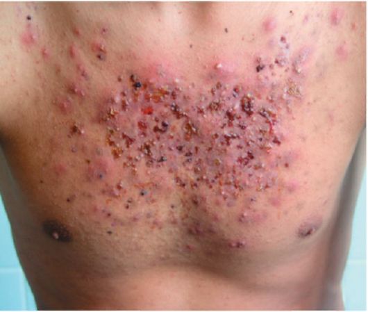 Рис. 28. Вульгарные угри (папуло-пустулезная форма)