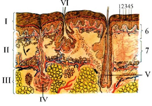 Рис. 1. Структура кожи I - эпидермис: 1 - роговой слой; 2 - стекловидный слой; 3 - зернистый слой; 4 - шиповатый слой; 5 - базальный слой. II - дерма: 6 - сосочковый слой; 7 - сетчатый слой. III - подкожная клетчатка: IV - потовая железа; V - волосяной фолликул; VI - сальная железа Полость рта конструируется в течение 2-го месяца внутриутробной жизни. Эпителий, выстилающий полость рта, язык, происходит из эктодермы, а область глотки, гортани покрыта эпителием мезодермального происхождения. Слизистая оболочка полости рта продолжается до линии смыкания губ и незаметно переходит в многослойный плоский эпителий красной каймы губ. Эпидермис (надкожица) - наружный многослойный отдел кожи, в котором в зависимости от стадии дифференцировки клеток различают 5 слоев, различающихся количеством и формой клеток, а также функциональной характеристикой. Основой эпидермиса является базальный, или зародышевый, слой (stratum germinativum), за ним идет слой шиповатых клеток (stratum spinosum), слой зернистых клеток (stratum granulosum), блестящий (str. lucidum) и роговой (str. corneum) слои. Непосредственно на границе с дермой находится однорядный базаль-ный (зародышевый) слой призматических цилиндрических клеток, который располагается на базальной мембране. Базальная мембрана образуется за счет корнеподобных отростков нижней поверхности этих клеток. Она осуществляет прочную связь эпидермиса с дермой. Кератиноциты базального слоя функционально находятся в состоянии митотического процесса, поэтому в цитоплазме их клеток много ДНК- и РНК-содержащих структур, рибосом и митохондрий. Митоти-ческая активность кератиноцитов базального слоя обеспечивает формирование вышележащих структур эпидермиса. Среди клеток ба-зального слоя располагаются меланоциты, образующие пигмент меланин, белые отростчатые эпидермоциты (клетки Лангерганса) и осязательные клетки (клетки Меркеля). Клетки Лангерганса имеют на поверхности НLA-Dr-молекулы, принимающие участие в начальных фазах иммунного ответа. В их цитоплазме выявляются ферменты адено-зинтрифосфатаза, щелочная и кислая фосфатаза, холинэстераза. В цитоплазме, кроме митохондрий, есть комплекс Гольджи, рибосомы, вакуоли. Над базальным слоем располагается слой шиповатых эпидермоци-тов, состоящий из 3-8 рядов клеток с множеством цитоплазматических выростов. Наиболее плотными межклеточными контактами являются десмосомы (desmos - соединение, soma - тело), в которых две клетки соединены плотной связью и скреплены пучками поперечно идущих волокон, глубоко проникающих в их цитоплазму. Эти волокна носят название тонофиламентов (греч. tonos - натяжение). Тонофиламенты складываются в пучки (тонофибриллы) и заканчиваются в зоне десмосом. Цитоплазматические выросты обеспечивают соединение клеток с обра- зованием между ними сети каналов, по которым циркулирует межклеточная жидкость. Десмосомы и тонофибриллы образуют внутренний опорный каркас клеток, защищающий их от механических повреждений. В шиповатом слое, как и в базальном, располагаются белые отростчатые эпидермо-циты, осуществляющие вместе с кератиноцитами эпидермиса защитную иммунную функцию. Клетки шиповатого слоя содержат в цитоплазме кератиносомы или тельца Одланда, в которых выявлена активность ферментов: кислой фос-фатазы, нуклеозидфосфатазы, эстеразы, что приближает их к лизосомам. Следующий за шиповатым зернист