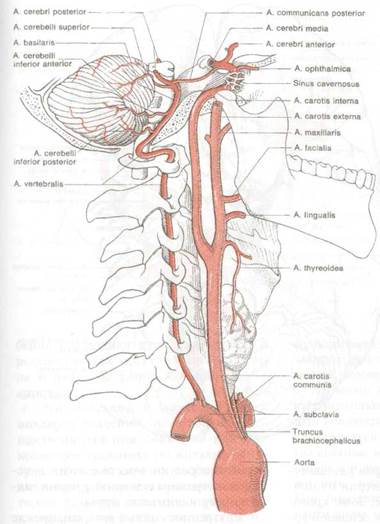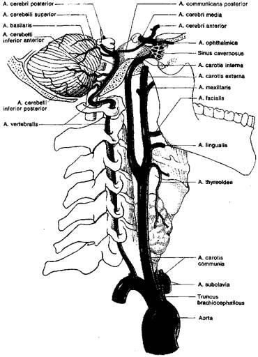 Рис. 8.33 Экстракраниальный ход больших артериальных сосудов (общая и внутренняя сонная артерии и позвоночные артерии).