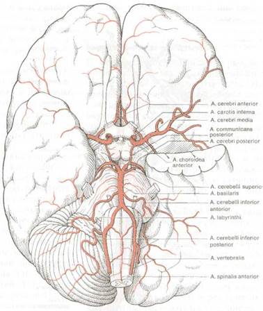Исходят из общих сонных артерий, берущих начало из брахиоцефального ствола справа и дуги аорты слева. На уровне щитовидного хряща общие сонные артерии делятся на наружные и внутренние. Наружные сонные артерии кровоснабжают верхнюю часть передних отделов шеи и лица и лобно-височные отделы черепа. Внутренне сонные артерии идут в глубине шеи и не отдают никаких ветвей. При прохождении через каротидные каналы каменистой кости и кавернозного синуса они отдают мелкие ветви ко дну среднего уха, твердой мозговой оболочке ската, полулунному узлу тройничного нерва и гипофизу. Ниже краниальных отверстий каналов зрительных нервов внутренние сонные артерии входят в субарахноидальное пространство и отдают глазничные артерии (аа. ophthalmicae), которые тотчас же заворачивают кпереди и проходят в орбиты через зрительные каналы, располагаясь под зрительными нервами. Они кровоснабжают все структуры орбиты: слизистую оболочку основной пазухи, клетки решетчатого лабиринта, большую часть полости носа, твердую мозговую оболочку передней черепной ямки. Они заканчиваются веточками, кровоснабжающими кожу лба, спинки носа, век и анастомозируют с лицевой и внутренней верхнечелюстной артериями, вляющимися ветвями наружных сонных артерий. Позвоночные артерии Являются первыми ветвями подключичных артерий. Они проходят через поперечные отверстия верхних шести шейных позвонков и входят в полость черепа между атлантом (первый шейный позвонок назван по имени титана Атланта из древнегреческой мифологии, в наказание поддерживавшего небесный свод) и боковым краем большого затылочного отверстия. Прежде чем попасть в полость черепа и позвоночные, и внутренние сонные артерии образуют S-образные сифоны, вероятно предназначенные для демпфирования пульсовых колебаний. Сонные артерии образуют свои сифоны в кавернозных синусах. Позвоночные артерии делают это по выходе из поперечных отверстий атланта. Эти артерии вначале идут кзади вдоль боковых поверхностей атланта, затем заворачивают вверх и медиально и входят в полость черепа с обеих сторон продолговатого мозга (рис. 8.33).