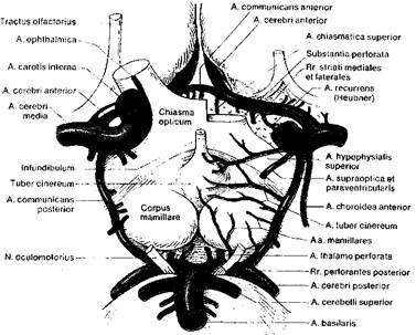 Кпереди от понтомедуллярного сочленения вертебральные артерии сливаются, чтобы образовать основную (базилярную) артерию, которая разделяется на задние мозговые артерии на понтомезенцефальном уровне. Зоны кровоснабжения позвоночных и основной артерий описаны ранее (см. рис. 3.52, 3.53, 3.54, 4.7, 4.8 и 4.9). Виллизиев круг Войдя в субарахноидальное пространство, внутренние сонные артерии направляются кзади под зрительные нервы, а затем латерально до уровня хиазмы, где они разворачиваются под прямым углом чтобы войти в сильвиевы щели. В месте поворота они отдают задние соединительные артерии (аа. communicantes posteriores), достигающие проксимальных стволов задних мозговых артерий и образуют вместе с ними и передним отрезком основной артерии заднюю дугу виллизиева круга. Внутренние сонные артерии, прежде чем они разделятся на переднюю и среднюю мозговые артерии, также отдают передние ворсинчатые артерии (рис. 8.35). Стволы передних мозговых артерий сразу же направляются к средней линии и соединяются друг с другом посредством передней соединительной артерии (а. communicans anterior). Таким образом, замыкается передняя дуга виллизиева круга. «Нормальный» виллизиев круг изображен на рис. 8.34 и 8.35 и обнаруживается менее чем в половине случаев. У остальных он очень вариабилен, особенно его задняя дуга (рис. 8.406). В редких случаях могут отсутствовать одна и даже обе задние соединительные артерии. Эти аномалии в норме не имеют никакого значения, но становятся существенными при снижении или прекращении кровотока по питающим сосудам. В таких случаях состояния виллизиева круга является решающим фактором развития ишемии, приводящей к инфаркту мозга тех или иных размеров. Тут важна также скорость развития нарушений мозгового кровообращения. В острых случаях обычно не остается времени на перераспределение кровотока. При постепенном развитии есть шансы на развитие достаточного коллатерального кровотока. При замкнутом виллизиевом круге резкие изменения кровотока обычно остаются без последствий. Например, если придавить или перевязать одну из внутренних сонных артерий, кровь тотчас шунтируется передними и задними сообщающимися артериями в зону кровоснабжения нефункционирующей артерии. От этого зависит успех эндартерэктомии внутренней сонной артерии. Помимо виллизиева круга существует несколько других, менее эффективных коллатералей, которые могут активизироваться. Как упоминалось ранее, глазничные артерии анастомозируют с лицевой и внутренней верхнечелюстной ветвями наружных сонных артерий. При определенных условиях они могут нести кровь из этих ветвей назад в интракраниальные внутренние сонные артерии. Аналогичным образом, имеются экстракраниальные анастомозы между затылочными ветвями наружных сонных артерий и позвоночными артериями. Анастомозы между мозговыми артериями будут упомянуты ниже.