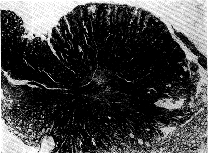 «ЭРОЗИВНЫЙ ГАСТРИТ» Кавычки подчеркивают колебания, с которыми это состояние было отнесено к гастритам. Речь идет об остром распространении эрозий, часто с массивным кровотечением, обусловливающим кровавую рвоту или мелену, слизистая желудка иногда в период покоя дает картину изменений в смысле хронического гастрита, но иногда бывает нормальной. Остается вопросом, мо/кно ли говорить здесь об обострении гастрита; в настоящее время скорее склонны думать о нарушении невоспалительного характера (стр. 555). ГИГАНТСКИЕ СКЛАДКИ Так называют значительно увеличенные желудочные складки, фиксированные, без естественной аутопластики, которые не разглаживаются при растягивании желудка. В литературе их обозначают различными терминами: г ипертрофический гастрит с гигантскими складками, гигантская гипертрофия слизистой, гиперругоз желудка, гигантизм складок и др. Речь идет о доброкачественных отклонениях, дающих характерную рентгенологическую и гастро-скопическую картину. При рентгенологическом исследовании (рис. 66) типичным является несоответствие между широкими дефектами, соответствующими складкам, и узкими щелями, заходящими часто довольно далеко за контур желудка. При гастроскопии они видны в виде искривлений цереброидных складок, не расправляющихся при введении воздуха в желудок; слизистая этих складок имеет нормальный вид. Они могут быть единичными, локальными или диффузными; чаще образуют изгиб в отделе большой кривизны. Если они поражают антрум, то могут осложняться транспилорическим выбуханием. Мы пока наблюдали 40 больных с этим отклонением;13 большинство из них имело признаки раздраженного желудка, некоторые вообще не предъявляли жалоб со стороны желудка. При гистологическом анализе биоптических и резекционных препаратов мы пришли к заключению, что в Сущности речь идет о п а т о л or ических и з ме нениях с у б-м у к о з ы, а именно о лимфатическом отеке, который постепенно фиброзно перерождается и тем самым фиксирует складки слизистой и препятствует их аутопластике. Сама слизистая гистологически нормальна или характеризуется различными формами обычного хронического Гастрита (рис. 67). Предрасполагающим моментом, очевидно, является гиперкинез желудка который обусловливает эти изменения преимущественно в области большой кривизны, где связь слизистой оболочки с подслизистой наиболее слаба. Следовательно, гигантские складки развиваются не вследствие заболевания самой слизистой, а вследствие патологического состояния подслизистой оболочки, вероятно, па невоспалительноой основе. Это отклонение имеет значение, главным образом, в дифференциальной диагностике, поскольку данные рентгенологического исследования могут возбуждать подозрение на опухоль. Из этих соображений часто рекомендовали хирургическое лечение, при необходимости и резекцию желудка. В действительности лечения не требуется; в виде исключения к хирургическому лечению необходимо прибегнуть при возможном выбухапии гигантской складки в луковицу.