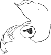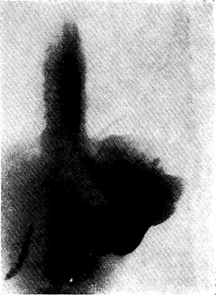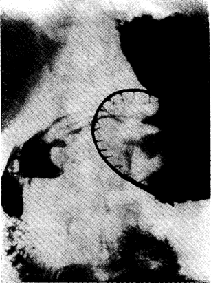 Рис. 79. Полипозньш рак желудка. Над углом на малой кривизне по-липозное образование с широким основанием и с неправильными бугристыми контурами. Стенка желудка в этом участке ригидна. прогноза; и прощупывающиеся опухоли бывают доступны резекции, и наоборот. Важно искать метастаз ы: в печени, в лимфатических узлах (под ключицей, в подмышечной области), в пупке в пространстве Дугласа (пальцевое исследование per rectum), в яичниках (per vaginam). Два других места расположения метастазов — легкие и брюшина. Диагностика рака желудка опирается в первую очередь на рентгенологическое исследование. Рентгенологическая картина далеко зашедшей опухоли является характерной, по гораздо важнее выявить незапущепные состояния, а в этих случаях симптомы менее выражены, часто бывают лишь неопределенными и непрямыми. По данным Вешана (Vesin21) рентгенологические признаки можно разделить в зависимости от того, идет ли речь об экзофитном росте, инфильтрирующем или о изъязвленной форме. Признаком экзофитных форм является дефект наполнения. Инфильтрирующий рост вначале проявляется только ригидностью стенки, позднее — деформацией и сужением просвета. Изъязвленная форма проявляется нишей. Полученные нами рентгенологические данные мы стремимся отнести к одной из четырех форм, приведенных на стр. 273. Их рентгенологические картины изображены на рис. 79—82. В технике рентгенологической диагностики ранних стадий рака желудка имеются различия: 1. Некоторые, например, п наши авторы подчеркивают значение функциональных изменений (угнетение перистальтики), и поэтому предпочитают скиаскопическое исследование. 2. В англосаксонских странах скиаскопию желудка практически не производят и основное внимание уделяют оценке изменений рельефа при небольшом наполнении. 3. Во Франции применяют метод Гутмана, при котором оценивают контуры желудка при максимальном наполнении на серии снимков, сделанных в положении на животе.