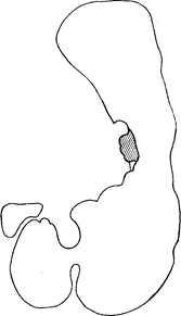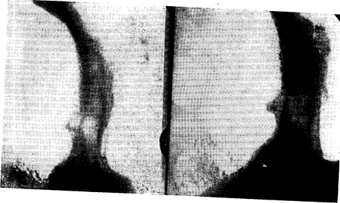 Рис. 856. Тот же больной. Контроль через 2 месяца: мениск увеличился, слегка выступает над малой кривизной, ниша слилась с ним. Дугообразный вал несколько шире, четко ограничен. Неоперабильная карцинома. заметить перистальтику, но это обычные данные, обнаруживаемые и при нормальном желудке; следовательно, имеется заметная разница между патологической рентгенологической картиной и нормальной гастроскопической картиной. 2. Атрофическо-гипертрофическая даже п о л и п о з-н а я форма хронического гастрита; такая картина определяется в особенности у больных с злокачественным малокровием и является преканцерозным состоянием.9 «Доброкачественные изменения а н т р у м а» относятся к состояниям, при которых гастроскопия оказывает весьма полезную службу. С ее помощью больных с функциональными изменениями можно избавить от пробной лапаротомии. Наоборот, выявление полипозных изменений слизистой является показанием к профилактической резекции желудка в связи с их преканцерозностью. АБНОРМАЛЬНЫЕ СКЛАДКИ И ПОЛИПЫ Гигантские складки (стр. 219) иногда с трудом рентгенологически можно отличить от карциномы, но гастроскопически диагноз бывает нетрудным; следовательно, они являются следующим показанием для гастро-скопии, где она имеет оправдание. Аналогичная ситуация наблюдается и при шовных полипах в оперированном желудке (стр. 261), при которых гастроскопии тоже принадлежит решающее слово. Хотя о гистологическом характере других полипов гастроскопия не может судить с уверенностью, но макроскопический вид в большинстве случаев позволяет сделать предположение о вероятной доброкачественности или злокачественности. САРКОМЫ Саркомы составляют 1—2% злокачественных опухолей желудка. Чаще веего встречается лимфосаркома (60% сарком), реже фибросаркома, лейомиосаркома и другие виды сарком. Диагностика сарком в основном не отличается от карциномы. Клинически считается характерным, что при значительной величине они вызывают относительно менее выраженные общие симптомы. Местные симптомы большей частью преобладают над анемией и кахексией. При гастроскопии проявляются различными данными, часто причудливыми. Рентгенологическая картина их иногда напоминает полипы или гигантские складки. Важным свойством лимфосарком является их чувствительность к облучению. Поэтому также рекомендуют операцию и биопсию и при больших опухолях, поскольку может оказаться, что опухоль, принимаемая благодаря своей величине за иноперабильную карциному, является лимфо-саркомой, доступной лучевой терапии. Более редким предметом дифференциальной диагностики являются г р а-вуломы и безоары (стр. 293). ГРаНУЛОМЫ Грануломы представляют собой ограниченные продуктивные воспаления, характеризующиеся узловатой или узелковой структурой, иногда напоминающей опухоли. У человека локализация их в пищеварительном аппарате встречается относительно редко. В качестве единичных случаев здесь описывается сифилис, актиномикоз, лимфогранулома, суб-мукозная эозинофильная гранулома, туберкулез и болезнь Крона; две последние чаще встречаются в кишечнике. Сифилис желудка встречается приблизительно только у 0,1 % больных с вторичным или третичным сифилисом. Это гуммозные инфильтраты, поражающие в первую очередь субмукозу. Слизистая над ними бывает атрофичной. Изъязвление гумм в