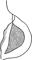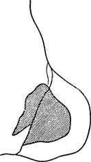 Рис. 83. Данные рентгенологического исследования, помогающие при дифференциальном диагнозе желудочных ульперапий: а) ульперозная форма рака — мениск Кармана, образованный распадающимся центром опухоли и окруженный опухолевым валом. В профиль мениск имеет вид ретенции полулунной формы, наружная граница которой расположена на уровне нормального изгиба желудка или только незначительно отличается от него. Краевой вал относительно узок, хорошо ограничен, на краю желудочного изгиба образует небольшое углубление (см. также рис. 84). В анфас центральная ретенция имеет неправильную овальную форму (см. также рис. 80); б) доброкачественная язва — ниша Гаудека, образованная дефектом стенки желудка, окруженная валом отека, воспалительного инфильтрата и локального спазма. В профиль ниша образует плюс наполнения, большая часть которого выступает над уровнем нормального изгиба желудка. Иногда ниша бывает базально ограничена суженной шейкой в форме воротника с широким полулунным прояснением, которое нерезко сливается с желудочным наполнением. По бокам ниши на краю желудочного изгиба имеется косое глубокое впячивание (см. также рис. 70). В анфас центральная ретенция имеет округлую или овальную форму.