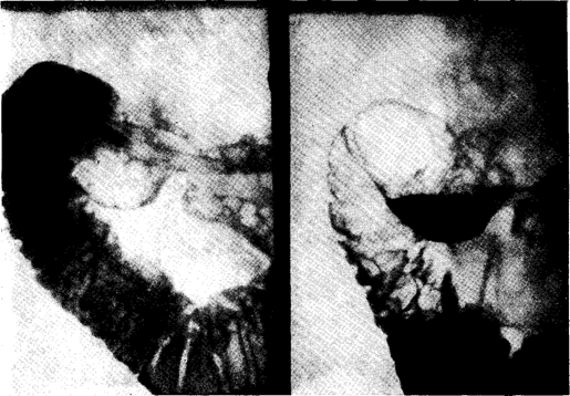 Рис. 126. Гипотоническая дуоденография — рецидивирующий панкреатит. Просвет двенадцатиперстной кишки симметричен, фатеров сосочек образует плоский дефект с неровной поверхностью примерно посередине медиального края нисходящей части. В ЧССР Герфорт10 установил в 151 случае хронического репидивирующего панкреатита следующую частоту отдельных комбинаций: холецистолитиаз и холедохолитиаз 35%, один холецистолитиаз 20 %, парапапиллярный дивертикул 6 %, алкоголизм 5 %, гиперлипемия 2 %. При этом, по Герфорту," принимает участие, главным образом, механический фактор (изменения фатерова сосочка с последующим повышением давления в выводных протоках поджелудочной железы), далее васкулярный, эндокринный и метаболический факторы, часта в комбинации друг с другом. В 32% случаев причина не была установлена, в этих случаях говорят о первичном или ндиопатическом типе панкреатита. Этиология первичного панкреатита неизвестна. Как уже было сказано, речь идет не о первичном воспалении, а о некрозе. Причины искали прежде всего в самопереваривании под влиянием ферментов, активированных внутри поджелудочной железы. Главное значение придавали трипсину, протеолитическое действие которого вызывает некроз и цепную реакцию с освобождением других ферментов, особенно калликреина, вызывающего коллапс и шок. Активацию ферментов объясняли по-разному, главным образом, попаданием желчи в выводной проток поджелудочной железы. Этот рефлюкс может иметь место особенно в тех случаях, когда общий желчный проток и проток поджелудочной железы вместе открываются в фатеровом сосочке, как это бывает примерно у 30% лиц, и когда фатеров сосочек закрыт вследствие спазма сфинктера Одди, вследствие отека или камнем (при вторичных панкратитах). Эта «теория общего канала» имеет много сторонников, однако большинство авторов полагает, что она одна не может дать полного объяснения; некоторые даже утверждают,.