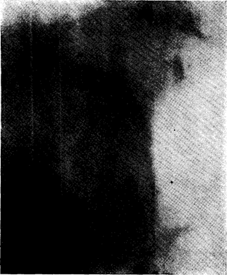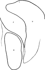 Рис. 127в. Тот 'же" больной. Боковая томограмма после инсу-фляции ретроперитонеума и желудка демонстрирует отчетливое увеличение тени хвоста поджелудочной железы. Р = поджелудочная железа, V == желудок, L = левая почка. смещается в гипогастральную область, в спину, в грудную клетку (рис. 122). Это постоянная, часто очень жестокая и агонизирующая боль. Вместе с болью почти всегда наблюдается тошнота и рвота; в начале бывает понос, позже скорее запор. Объективно общее состояние бывает различным: при тяжелой форме бывает драматическая картина «острого живота», при молниеносной форме развивается ранний шок, являющийся предвестником близкой смерти. Больные бывают дезориентированы, что может быть обусловлено эндотоксикозом, но также и опьянением. Температура часто повышается, при гнойной форме может иметь септический характер; имеются здесь и другие признаки сепсиса. При обширных жировых некрозах может появиться тетания вследствие гипокаль-пемии. Небольшая часть больных имеет слабую желтуху (вследствие сдав-ления желчного протока при отеке поджелудочной железы). При исследовании живота данные зависят от перитонеальной реакции. При легкой форме не находят ничего особенного, кроме неопределенной диффузной чувствительности и метеоризма. Более характерным является обнаружение, главным образом, поперечной ободочной кишки, растянутой газами (признак Гербиха). Но и при тяжелых формах не бывают выражены признаки перитонеального раздражения. Патогономоничными, но редко встречающимися являются симптомы, обусловленные проникновением крови из ретроперитонеума под кожу брюшной стенки. Так образуются цветные пятна в паховых областях (признак Грея-Турнера или около пупка (признак Куплена), которые меняют цвет также, как гематома. Необходимо искать признаки раздражения плевры (шум трения, выпот, хрипы на основании), особенно на левой стороне. Данные лабораторного исследования. Недостаток клинической диагностики частично дополняется с помошью лабораторных методов исследования. Самым простым и самым надежным является выявление ферментов в крови и в моче. Уровень диастаз в сыворотке повышается уже в первые часы, достигает вершины через 24—48 часов и постепенно исчезает в течение нескольких дней. Уровень липаз изменяется аналогично, несколько запаздывая. В моче также концентрация обоих ферментов повышается позднее, чем в сыворотке и сохраняется более длительно. Повышение уровня ферментов может быть неспецифическим — при острых заболеваниях другого происхождения или после применения некоторых лекарств, например, после опиа-тов — но оно бывает небольшим. В качестве верхней границы нормы диастаз в сыворотке приводят 64 ед. и в моче — 128 ед. (по Вольгемуту); повышение до 128—256 ед. в сыворотке может быть обусловлено неспецифически; величины свыше 256 ед. являются подозрительными, свыше 512 ед. — характерными.» С другой стороны, величины диастазы и липазы, как и всех других ферментов, зависят от времени, в котором получают кривую концентрации. Если пропускают ее максимум, то получают мнимые отрицательные данные. Поэтому рекомендуют исследовать ферменты в сыворотке хотя бы 2 раза в день в течение первых двух дней. Повышение, естественно не наблюдается при далеко зашедшей функциональной недостаточности. Но в этом случае диагноз бывает известен, и то