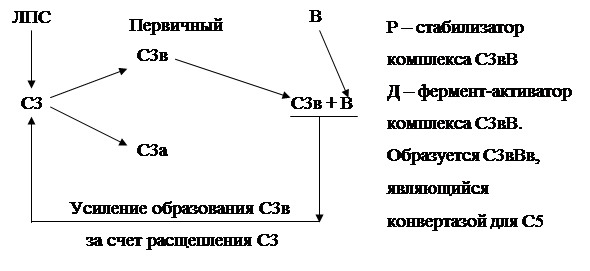 В 1954 году Л. Пилломер обнаружил сывороточный фактор, который, как тогда считалось, активирует С3 и является центральным звеном альтернативного пути активации комплемента. Он был назван пропердином. Вскоре были обнаружены еще два дополнительных сывороточных белка – В и D. Вместе с компонентами комплемента С5 – С9 они были объединены в пропердиновую систему. Действительная роль пропердина (Р) в альтернативном пути активации оказалась иной. Он является стабилизатором комплекса С3ВВ (схема3).