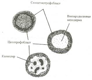 Рис. Микроскопическое строение ворсин. 1 - Синцитий 2 - Цитофофобласт 3 - Кровеносные сосуды 4 - Эмбриональная соединительная ткань