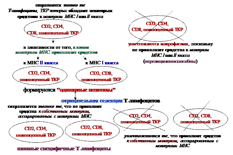 превратится в Т-хелпер, а при взаимодействии с антигенным комплексом, представленным на поверхности макрофага, – в Т-клетку воспаления. Кроме того, в корково-медуллярной зоне на стадии «двойных позитивов» происходит и отрицательная селекция Т-лимфоцитов, заключающаяся в элиминации Т-лимфоцитов проявляющих сродство к собственным молекулам, ассоциированным с молекулами МНС. Фенотип Т-лимфоцитов, не прошедших отбор на специфичность (положительную или отрицательную селекцию), соотвествует двойным позитивам (СD4CD8) и указывает на незавершенность дифференцировки. Таким образом, Т-лимфоциты, погибающие в тимусе, не выдерживают два условия положительной селекции (проявляют либо очень высокую аффинность ТКР к молекулам МНС, либо вообще ее не проявляют), либо проявляют реакции на собственные антигены, в результате чего элиминируются отрицательной селекцией. Меньшая же часть популяции Т-лимфоцитов, прошедших жесткие условия отбора на специфичность, покидает тимус и расселяется в периферических органах иммунной системы. Весь путь доантигенного развития Т-лимфоцитов создает потенциал для возможной в будущем (в периферических органах иммунной системы) встречи с различными чужеродными антигенами, но при этом исключает выход в циркуляции наивных Т-лимфоцитов, настроенных на собственные антигены и тех клеток, которые не проявляют сродства к молекулам МНС, в результате чего окажутся неспособными взаимодействовать с комплексами «антигенная детерминанта-молекула МНС» на поверхности антигенпрезентирующих клеток, а, значит, и неспособными пройти антигензависимую дифференцировку, превратится в зрелые и развить иммунный ответ. Date: 2015-07-02; view: 721; Нарушение авторских прав |