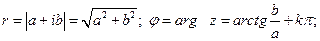 Такая запись называется тригонометрической формой записи комплексного числа. При этом полярный радиус r точки А называется модулем комплексного числа, а полярный угол j - аргументом комплексного числа.