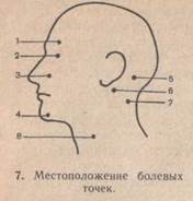 Нервы головы и шеи. От головного мозга отходят 12 пар черепных нервов, иннервирующих: органы чувств (чувствительные); жевательные и все мимические мышцы; мышцы языка и частично мышцы шеи (двигательные); нервы, воспринимающие температурные и болевые раздражения; железы, гладкие мышцы органов чувств. Основными нервами, иннервирующими лицо, являются VII пара – лицевой нерв (двигательный) и V пара – тройничный нерв (смешанный) (рис. 6). Лицевой нерв выходит из черепа через шилососцевидное отверстие, образует разветвление, называемое большой гусиной лапкой. Основными его ветвями являются височная, скуловая, щечная, краевая ветви нижней челюсти и шейная. Ветви этого разветвления иннервируют все мимические мышцы лица, затылочную мышцу, мышцы ушной раковины, частично мышцы дна полости рта и подкожную мышцу шеи. Тройничный нерв иннервирует кожу лица и переднюю часть головы. Он имеет три ветви: 1) глазной нерв, иннервирующий кожу в области лба, верхнего века, слезные железы и полость носа; 2) верхнечелюстной нерв, иннервирующий кожу нижнего века, боковой поверхности носа и верхней губы, передней части височной области и мягкие ткани щеки; 3) нижнечелюстной нерв (смешанный), иннервирующий жевательные мышцы, мышцы дна полости рта и кожу нижнего отдела лица. Иннервация шеи осуществляется ветвями шейного сплетения и задними ветвями шейных нервов, иннервирующих кожу затылочной области и глубокие мышцы шеи. Передние ветви шейных нервов, соединяясь, образуют шейное сплетение. Ветви, отходящие от сплетения, подразделяются на кожные, мышечные и смешанные. Они иннервируют кожу затылочной области, ушной раковины, шеи. Мышечные ветви иннервируют трапециевидную и грудино-ключично-сосцевидную мышцы. В области головы имеются болевые точки (рис. 7). Интенсивные движения при массаже в области этих точек дают неприятные ощущения.
