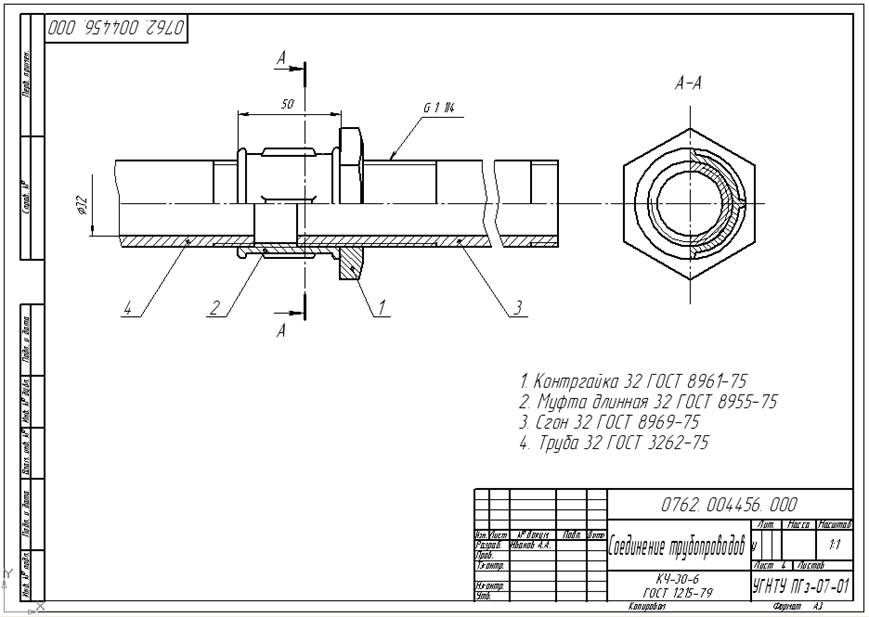 Упражнение выполняется в следующей последовательности: 1. В левой части соединения вычертить фрагмент трубы. 2. Трубу ввинтить в муфту. Ее показать недовинченной в соединительную деталь на 2-4мм (1-2 нитки), поэтому труба на чертеже должна выйти за торец соединительной части детали. 3. Справой стороны в муфту ввинчивается сгон. Сгон ввинчивается в муфту тем концом, на котором нарезана длинная резьба. Положение сгона фиксируется контргайкой. Все размеры данных стандартных изделий определяются согласно ГОСТ, в зависимости от условного прохода трубы DN, по таблицам А.17, А.18 приложения А. 4. Определить положение плоскости профильного разреза. Она располагается таким образом, чтобы она проходила через сгон, муфту и ребра муфты. Обозначить и вычертить соответствующий разрез. 5. Дочертить фронтальный и профильный разрез, совместив вид с разрезом. Выполнить штриховку по материалу изделий, попавших в секущую плоскость. 6. Нанести размер диметра условного прохода трубы и стандартной длины соединительного элемента. Обозначить трубную резьбу. 7. В правом нижнем углу чертежа записать условные обозначения стандартных изделий и нанести их позиции на чертеже. 8. Оформить основную надпись.