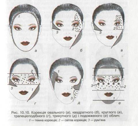 Перед нанесением макияжа необходимо: — тщательно подготовить кожу: очистить и увлажнить ее соответственно типу кожи лица клиентки; — изучить пропорции лица для того, чтобы по необходимости подкорригировать лицо модели, выделив при этом отдельные его черты. Для выполнения необходимой коррекции используют два оттенка: — темный, чтобы уменьшить, спрятать слишком выступающие места; — светлый для создания дополнительного объема, увеличения и выделения рельефов. Текстура и цвета косметических средств избираются соответственно особенностям модели: тип кожи, овал лица, разрез глаз, форма носа, губ и т.п.. Предлагаем технику макияжа для коррекции косметических недостатков (рис. 10.10). Схема нанесения макияжа. Чтобы макияж выглядел более естественным и держался в продолжение дня, при нанесении разных декоративных средств нужно обязательно соблюдать такой порядок:
