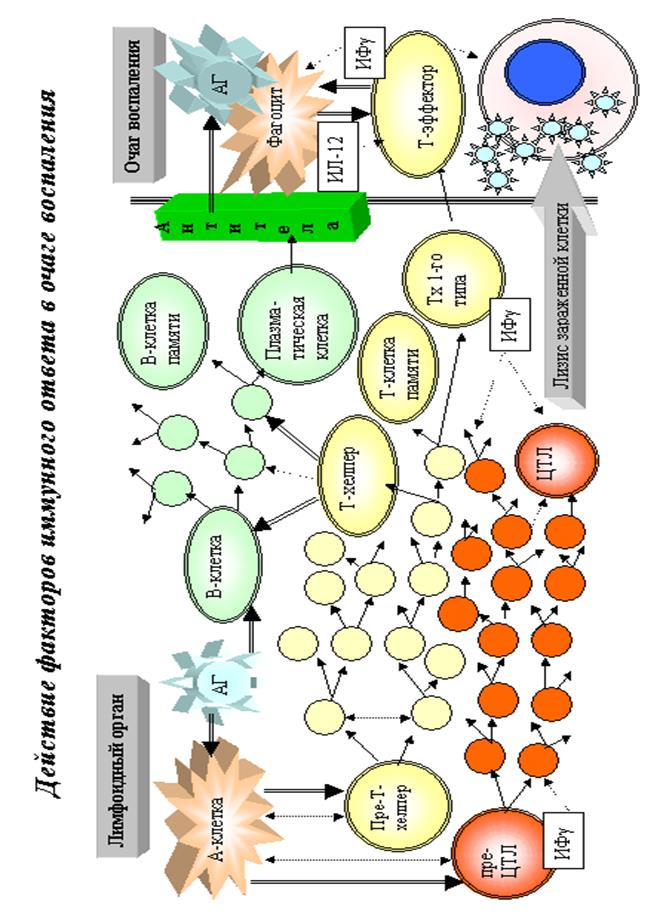 Антитела могут играть важную роль при вирусных инфекциях, особенно на ранних стадиях – препятствуют проникновению вирусов в чувствительные клетки (вакцинация против вируса полиомиелита способна защитить нейроны от воздействия вируса, но не способна помочь на более поздних этапах заболевания). Антитела способны играть и негативную роль, особенно на поздних этапах некоторых вирусных инфекций (грипп, респираторно-интерстициальная), когда образуются иммунные комплексы АТ – вирус, ведущие к развитию в организме осложнений – иммунокомплексные патологии (васкулит после гриппа). Сущность Т иммунного ответа сводится к реакции образования антигенспецифических Т - лимфоцитов (Тх1,2, ЦТЛ, Т – клеток памяти). Клетки памяти характеризуются быстрой пролиферацией при действии специфического АГ с образованием большого количества клеток – эффекторов, синтезирующих много Ig и цитокинов – формирующих быстрый и сильный иммунный ответ. Сохраняются в организме длительно (даже пожизненно) (оспа, корь) – это лежит в основе поствакцинального иммунитета. Не передаётся по наследству и формируется в процессе жизни. Главной функцией ЦТЛ в противоинфекционной защите является уничтожение клеток инфицированных внутриклеточными паразитами (вирусы, микоплазмы, хламидии и др.). Тх1, помимо продукции цитокинов, «вооружающих» другие клетки, принимают прямое участие в уничтожении возбудителей, персистирующих и размножающихся в макрофагах. Активация последних посредством γ – ИФН приводит к гибели внутриклеточного возбудителя в фаголизосоме. Ведущие механизмы противовирусного иммунитета: · нейтрализация вируса опсонинами с последующим фагоцитозом и цитолизом. · комплемент-зависимая цитотоксичность. · цитотоксические Т-лимфоциты. · макрофаги. · NK клетки Ведущие механизмы антибактериального иммунитета: · фагоцитоз · активация системы комплемента. · IgA, sIgA - предотвращают адгезию микроорганизмов к поверхности слизистых. · антигенспецифические антитела (IgM, IgG).