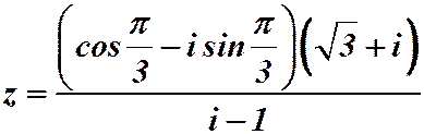2) Деление. При делении двух комплексных чисел, заданных в тригонометрической форме, их модули делятся, а аргументы вычитаются, то есть: