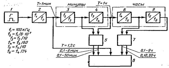 1– кварцевый генератор; 2 – делители частоты; 3, 4 – счетчики минутных импульсов; 5, 7 – дешифраторы; 6, 9 – счетчики часовых импульсов; 8 – блок индикации
