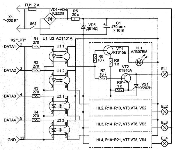 В состав схемы, кроме изображения, входят надписи, характеризующие входные и выходные цепи, позиционные обозначения элементов и перечень элементов. Всем изображенным на схеме элементам и устройствам присваивают условные буквенно-цифровые позиционные обозначения в соответствии со стандартом [12]. Связь между условными графическими обозначениями и перечнем элементов осуществляется через позиционные обозначения. Позиционные обозначения проставляют на схеме рядом с условным графическим обозначением элемента или устройства, как правило с правой стороны или над ним. Надписи и знаки, предназначенные для нанесения на изделие, на схеме заключают в кавычки. Допускается указывать адреса внешних соединений (если они заведомо определены), например «≠ А–Х3:5», т. е. выходной контакт должен быть соединен с 5 контактом разъема ХЗ устройства А, или «Прибор А», если такая надпись обеспечивает однозначность присоединения. На схеме изделия, в состав которого входят самостоятельные устройства, позиционные обозначения элементам присваивают в пределах каждого устройства, а при наличии нескольких одинаковых устройств – в пределах этих устройств. Если в состав изделия входят функциональные группы, то вначале присваивают позиционные обозначения элементам, не входящим в функциональные группы. Для одинаковых функциональных групп позиционные обозначения элементов, присвоенные в одной из них, повторяют во всех последующих группах (рисунок 5.9). Разрешается раздельно изображенные части элементов соединять линией механической связи (штриховая линия), проставляя позиционные обозначения элементов у одного или у обоих концов этой линии. При разработке на одно изделие нескольких самостоятельных принципиальных схем в каждой схеме должен быть помещен перечень только тех элементов, позиционные обозначения которым присвоены на данной схеме. При повторном изображении отдельных элементов на нескольких схемах за ними сохраняются позиционные обозначения, присвоенные им на одной из схем. В этом случае на схемах помещают указания по типу: «Элементы, изображенные на схеме и не включенные в перечень», см. АБВГ.ХХХХХХ.ХХХЭЗ.
