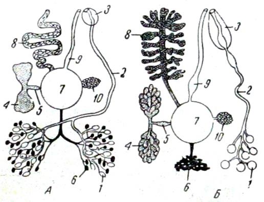 Мужские органы размножения у цестод представлены семенниками в виде обыкновенно весьма многочисленных фолликулов (пузырьков). От семенников отходят тонкие семявыносящие канальцы, которые, сливаясь, дают начало семяпроводу, идущему к копулятивному органу (циррусу). Женский половой аппарат устроен сложнее. Основной его частью является яичник, как правило, двухлопастной. От перемычки, соединяющей лопасти яичника отходит мускулистый яйцевод, служащий для продвижения зрелых яиц. В яйцевод открываются желточный проток и влагалище. Дистальный отдел влагалища открывается на дне половой клоаки. Проксимальный конец влагалища вздут и функционирует как семяприёмник. Полость, принимающая в себе отверстие яичников, желточников и протоки железок тельца Мелиса, называется оотипом; из оотипа выходят влагалище и трубчатая матка, которая или открывается самостоятельным отверстием, или остается замкнутой. Форма зрелой (т. е. совершенно развитой матки, наполненной яйцами) характерна: у одних цестод она имеет вид розетковидно сложенной трубки, у других построена в форме продольного ствола с боковыми ветвящимися отростками, у третьих — в виде поперечно вытянутого мешка и т. п. Влагалище открывается рядом с мужским половым отверстием в половую клоаку или на брюшной поверхности членика, или на его боку, причем половые отверстия неправильно чередуются между члениками по обеим сторонам или же все лежат на одной стороне тела (Рис 1).
