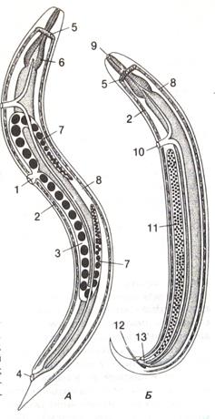 Схема строения самки (А) и самца (Б) нематоды. 1 – влагалище; 2– брюшной нервный тяж; 3– матка; 4– анус; 5– нервное кольцо;: – глотка; 7 – яичник; 8 – спинной нервный тяж; 9 – рот; 10 – выделительный канал; 11 – семенник; 12 – спикулы, хитиноидные щетинки, входящие во влагалище самки при копуляции; 13 – клоака. В противоположность плоским червям почти все нематоды раздельнополы. Половой диморфизм выражается в том, что самки более крупные, чем самцы. Задний конец тела самцов закручен на брюшную сторону. Жизненный цикл нематод более простой, чем у плоских червей. Развитие происходит с метаморфозом. В жизненном цикле обязательно присутствуют 4 личиночные стадии и одна взрослая. Переход личинок от одной стадии к другой осуществляется в процессе линьки, сопровождающейся сменой хозяев, миграцией в теле или смене сред обитания. У свободноживущей сапротрофной нематоды Caenorhabditis elegans под действием голодания и ряда других вредных факторов и выделений взрослых особей, уже столкнувшихся с этими факторами, появляются дауэровские личинки, у которых продолжительность жизни увеличивается в несколько раз. Развитие происходит у большинства видов без смены хозяев. Многие паразитические формы являются геогельминтами, так как взрослые особи ведут паразитический образ жизни, а яйца и личинки развиваются во внешней среде без промежуточного хозяина. Другие виды (биогельминты) нуждаются в промежуточных хозяевах. Личинки многих нематод обладают способностью к передвижению по органам хозяина. Заболевания, вызываемые круглыми червями, называются нематодозами. Многие заболевания, вызываемые круглыми червями, широко распространены и имеют весьма тяжелые последствия для человеческого организма. Среди них – аскарида человеческая, трихинелла спиральная, кривоголовка 12-перстной кишки и мн. др. Date: 2015-07-02; view: 1070; Нарушение авторских прав |
