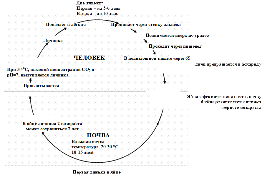 Жизненный цикл. Аскарида развивается без промежуточных хозяев. Человек, в кишечнике которого паразитируют самки и самцы аскарид, являются единственным источником инвазии. Оплодотворенные самки откладывают яйца. Зрелая самка способна отложить 240 тыс. яиц в сутки. Выделенные с фекалиями яйца аскарид содержат незрелую личинку и для дальнейшего развития должны попасть в почву. В почве яйца аскарид при оптимальной температуре (не ниже 12 и не выше 36 градусов), влажности и наличии кислорода в течение 3-4 недель становятся инвазионными (лат. invasion – внедрение). Инвазионными яйца аскарид становятся после того, как личинка перелиняет. Оптимальная температура развития яйца лежит в пределах от 24 до 30 градусов Цельсия. Заражение аскаридозом происходит при попадании яиц, содержащих ивазионную личинку, в пищеварительную систему человека. Выход личинки из яйца происходит в нижнем отделе тонкого кишечника. Размеры личинки: в длину 0,2 мм при толщине 0,015 мм. Личинка внедряется в сосуды кишечной стенки, током крови заносится в печень, через печеночную вену попадает в нижнюю половую вену, далее в правое сердце. Через легочную артерию достигает легких. В легких личинка пробуравливает кровеносные сосуды и стенки легочных альвеол и попадает в просвет альвеол. Часть личинок при этом может попадать в большой круг кровообращения и обнаруживаться в различных органах. В легких личинка дважды линяет, её размеры увеличиваются до 2,2 мм. Во время миграции в кровеносной системе личинки питаются кровью. Затем они последовательно переходят из легочных пузырьков в бронхи, дыхательное горло и в ротовую полость хозяина и отсюда вместе со слюной вторично попадают в кишечник. Здесь они линяют ещё раз и достигают половой зрелости. Все развитие аскарид от момента инвазии до начала продуцирования самками яиц продолжается около 10-11 недель. При повторных заражениях большинство личинок инкапсулируется в печени и лишь немногие достигают лёгких. Однако способность к защитным реакциям временна. Общий срок жизни червей обычно не превышает 10-12 месяцев. Кладка яиц прекращается в течение последних двух месяцев паразитирования. Питается взрослая аскарида содержимым кишечника хозяина. В течение аскаридоза отчетливо выявляются два периода: первый связан с миграцией личинок, второй – с паразитированием половозрелых особей в кишечнике. Мигрирующие личинки травмируют стенки кишечника, печень и особенно легкие. Важную роль играет сенсибилизация (повышение чувствительности) организма чужеродными белками, источником которых являются продукты обмена личинок и сами погибающие личинки. В случае сильного заражения у больного отчетливо появляются признаки аллергии: крапивница, зуд, насморк, кашель, явления бронхиальной астмы и т.п. Обитание взрослых червей в кишечнике хозяина сопровождается, как правило, общей интоксикацией (токсин – яд органической природы) организма и аллергическими явлениями, связанными с всасыванием выделяемых паразитами продуктами обмена. Клиническая картина слагается из кишечно-желудочных и нервных симптомов. Снижается аппетит, наблюдается расстройство кишечника и острые боли в животе. Заболевший становится раздражительным, у него снижается трудоспособность и нарушается сон, память. Дети ночью во сне скрежещут зубами. Нередко развивается анеми