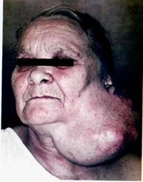 Клиника. Плеоморфная аденома растет медленно, равномерно, бессимптомно, обнаруживается, как правило, после достижения заметных размеров. В случае развития, воспалительного процесса (чаще обтурационного сиалоаденита) рост опухоли может несколько ускориться даже при доброкачественном ее росте, что обусловлено накоплением секрета в кистозных полостях. Поражение ветвей лицевого нерва не наблюдается При поражении околоушной железы отмечается ограниченная припухлость мягких тканей в околоушной или в позадичелюстной области. Кожа в цвете не изменена, собирается в складку. Опухоль плотная, безболезненная, малоподвижная, поверхность на ней гладкая или бугристая. При рецидиве данной опухоли, обнаруживаются множественные узлы различной величины (как подвижные, так и плотно спаянные между собой). При локализации опухоли в позадичелюстной области рост опухоли направлен преимущественно в сторону окологлоточного пространства. При поражении поднижнечелюстной железы опухоль обычно развивается из наружного отдела. Проявляется в виде четко контурированного плотного узла округлой формы, плотно спаянного с железой. Плеоморфная аденома малых слюнных желез проявляется в виде подвижного узла округлой (на мягком небе или в ретромолярной области) или полушаровидной (на твердом небе) формы, размеры варьируют от 1 до 3 см. Слизистая над опухолью в цвете не изменена, при травме - возможно изъязвление. Со временем развивается резорбция костной ткани.