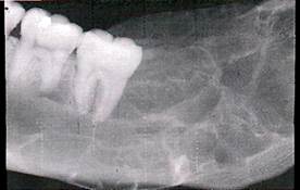 Рентгенологическая картина. Определяется очаг деструкции костной ткани с нечеткими границами. В некоторых случаях может иметь вид мелких ячеистых образований, разделенных костными перегородками.