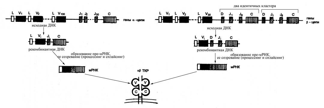 Процессы рекомбинации, транскрипции, сплайсинга и трансляции генетического материала для a- и b-цепей при образовании антигенраспознающих рецепторов Т-лимфоцитов аналогичны тем, что происходят в В-лимфоцитах при синтезе иммуноглобулинов. В частности, структура вариабельного домена a-цепи Т-клеточного рецептора во многом зависит от случайной рекомбинации какого-то одного из 100 V-генов с каким-то одним из 50 J-геном, которая осуществляется путем делеции участка ДНК между этими генами. В результате такой делеции возникает определенный ViJi-локус, кодирующий вариабельный домен a-цепи. Затем пре-мРНК, комплементарная ViJi-локусу ДНК, в процессе сплайсинга объединяется с пре-мРНК, комплементарной С-гену для a-цепи, в результате чего формируется зрелая мРНК, кодирующая a-цепь, которая и транслируется. При синтезе b-цепи Т-клеточных рецепторов в геноме Т-лимфоцитов происходит случайная рекомбинация какого-то одного из 30 V-генов с одним из двух генных кластеров DJ-генов. При этом внутри самого DJ-генного кластера осуществляется рекомбинация между D-геном и каким-то одним из 6 J-генов. В результате отмеченных соматических рекомбинаций возникает определенный ViDJi-локус, кодирующий синтез вариабельного домена b-цепи определенной специфичности. Затем в процессе сплайсинга пре-мРНК, комплементарная ViDJi-локус ДНК, объединяется с пре-мРНК, комплементарной С-гену для b-цепи, в результате чего формируется зрелая мРНК, кодирующая b-цепь с определенной специфичностью вариабельного домена.