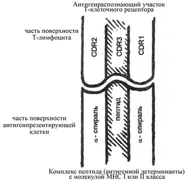 Несмотря на описанное сходство в генетическом контроле Т-клеточных рецепторов Т-лимфоцитов и иммуноглобулинов В-лимфоцитов, которое заключается в многообразии генов, кодирующих вариабельные домены, а также процессах соматической рекомбинации генома и последующего созревания мРНК, все же в генетическом контроле Т-клеточных рецепторов имеются некоторые особенности. Эти особенности обусловлены тем, что Т-клеточный рецептор, в отличие от иммуноглобулиновых рецепторов В-лимфоцитов, распознает не нативный антигенный эпитоп, а его комплекс с относительно мало изменчивыми молекулами МНС. В частности, в вариабельном домене a- и b-цепей Т-клеточного рецептора имеются по 3 петлеобразные гипревариабельные области, называемые CDR-участками (от англ. complementary determining region). Первые две из этих гипервариабельных петель занимают периферию домена и ответственны за взаимодействие с a-спиральными участками двух антигенсвязывающих доменов МНС, ограничивающих собой антигенсвязывающую щель молекулы МНС. Третьи гипервариабельные петли a- и b-цепей Т-клеточного рецептора при формировании его антигенсвязывающего центра оказываются расположенными во внутренней части этого центра и собственно и обеспечивают взаимодействие с антигенным эпитопом, фиксированном между a-спиральными участками антигенсвязывающего центра молекулы МНС. CDR1- и CDR2 -участки вариабельных доменов a- и b-цепей Т-клеточного рецептора кодируются преимущественно V-геном, тогда как большая часть CDR3-участка – J-геном. В связи со сравнительно небольшой изменчивостью антигенсвязывающих участков молекул МНС, нет необходимости в большой изменчивости CDR1- и CDR2 -участков вариабельных доменов a- и b-цепей Т-клеточного рецептора, которые ответственны за связь с антигенсвязывающими участками молекул МНС. Это, вероятно, и является причиной гораздо меньшего в сравнении с В-лимфоцитами, разнообразия V-генов, кодирующих вариабельные домены a- и b-цепей Т-клеточного рецептора в Т-лимфоцитах. Вместе с тем J-гены, кодирующие CDR3-области вариабельных доменов a- и b-цепей Т-клеточного рецептора, отличаются гораздо большим разнообразием, по сравнению с таковыми генами, кодирующими иммуноглобулины, поскольку CDR3-области Т-клеточных рецепторов как раз и ответственны за взаимодействие с антигенным эпитопом.