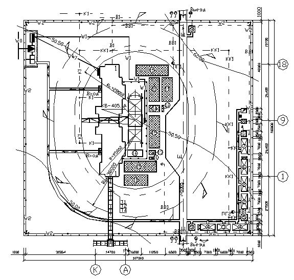 Регулирование и безопасность движения автотранспорта по территории строительства обеспечено устройством временных дорог, установкой знаков ограничения скорости движения, указателей движения по строительной площадке. Временные дороги устраиваются из щебня шириной 3.5 м. Движение машин двустороннее. Изделия заводского изготовления, детали и конструкции складируются в зоне действия крана. Площадки открытого хранения обеспечивают складирование нормативного запаса для бесперебойного производства работ. Раскладка материалов предусматривает проходы шириной 1.0 м для рабочих с целью обеспечения удобства строповки конструкций. Для освещения строительной площадки в вечернее и ночное время предусмотрена система временного освещения. Подача электроэнергии монтажным механизмам осуществляется по изолированным кабелям. Бытовые, временные помещения находятся вне зоны действия крана. Внутриплощадочное временное водоснабжение осуществляется путем присоединения к действующей системе водоснабжения. Временный водопровод рассчитан на удовлетворение хозяйственно- бытовых и производственных потребностей. Временная трансформаторная подстанция осуществляет подачу электроэнергии путем подсоединения ее к действующей электросети. Вся территория строительной площадки ограждается временным забором. Площадки открытого складирования строительных конструкций и материалов располагают в рабочей зоне монтажных кранов. Эти краны должны быть подключены к электролинии через распределительные шкафы, устанавливаемые у каждого строящегося объекта, и щиты для подключения подъемников. Опасные зоны от башенных кранов не должны перекрывать эксплуатируемые магистральные проезды. В опасных зонах не должны располагаться временные административно- бытовые здания и эксплуатируемые объекты жилищно-гражданского назначения. На стройгенплане реконструкции микрорайона устанавливают также расположение: - действующих, разбираемых и перекладываемых инженерных сетей; - существующих зданий и сооружений, не подлежащих реконструкции; - возводимых зданий и сооружений; - путей транспортирования строительных материалов и конструкций; места расположения бытовых временных зданий и помещений; - безопасного прохода для строителей и жителей, находящихся в эксплуатируемых зданиях. Различают строительные генеральные планы двух видов: · общеплощадочные · объектные Общеплощадочный стройгенплан разрабатывается на всю территорию строительства комплекса объектов и включает, наряду с существующими и проектируемыми объектами, временные здания и сооружения, основные коммуникации, склады, дороги, строительные машины и механизированные установки, обслуживающие нужды строительства комплекса объектов в целом. Он разрабатывается проектной организацией в составе раздела проекта "Организация строительства" на первой стадии проектирования обычно в масштабе 1:1000 или 1:2000. Объектный стройгенплан составляется только на площадку, непосредственно прилегающую к конкретному зданию или сооружению, и определяет расположение временных зданий, инженерных сетей, строительных машин и устройств, необходимых для возведения отдельного объекта строительства. Объектный стройгенплан разрабатывается строительной организацией в составе проекта производства работ (