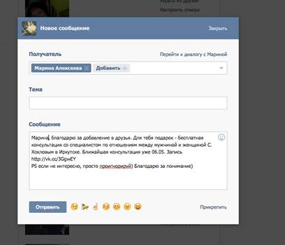 В открывшееся поле вводим текст (примечание: для улучшения конверсии, не поленитесь ввести имя получателя сообщения), нажимаем кнопку отправить.