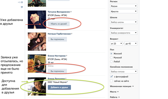 После того, как сообщение отправлено, присваиваем девушке метку, которая поможет нам потом отделить ее от тех, кому сообщение не рассылалось. (Как присвоить метку смотри выше). Вот и все, инструкция получилась довольно длинная, однако делается это все легко и быстро. 4. Приглашение в друзья Для приглашения зайди в нужную группу, и сделай сортировку по ее участникам как показано в пункте 1, т.е. выбери: Россия, Иркутск, возраст от 23 до 45 лет, женщины.