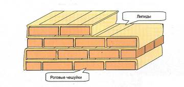 Кожа человека состоит из трех слоев - эпидермиса, дермы и гиподермы (подкожная клетчатка) - Рисунок «СТРОЕНИЕ КОЖИ» на стр.3 Роговой слой Верхний слой эпидермиса называется – роговой. Это не четвертый слой кожи, а верхний слой эпидермиса. В косметологии его рассматривают отдельно, так как именно на него направлено действие большинства косметических средств. Роговой слой - это тончайшая пленка на поверхности кожи, которую можно приподнять иголкой и которая образует стенку пузырей при ожоге (Рис.1). Если положить ее под микроскоп, то можно увидеть множество полупрозрачных чешуек (роговых чешуек или корнеоцитов), которые построены из особого белка - кератина. Когда-то роговые чешуйки были живыми клетками, но в процессе развития утратили ядро и клеточные органеллы. С того момента как клетка лишилась ядра, она формально становиться мертвой. Главная задача этих мертвых клеток - защитить то, что находиться под ними. Иными словами, они выполняют туже роль, что чешуя ящериц или перья птиц. Разве что выглядят менее впечатляюще. Роговые чешуйки плотно прилегают друг к другу, соединяясь специальными выростами на оболочке. А все пространство между слоями роговых чешуек заполнено веществом, представляющим собой смесь липидов (жиров). Эти липиды (жиры) синтезируются в эпидермисе. Межклеточное вещество выполняет туже роль, что цементная кладка в кирпичной стене, т.е. скрепляет роговые чешуйки между собой и обеспечивает целостность всей структуры (Рис.2).